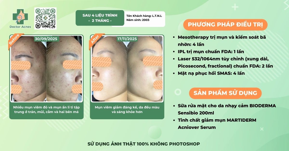 Tại Phòng khám chuyên khoa Da liễu Doctor Acnes, thế mạnh là điều trị mụn và sẹo mụn theo đúng chuẩn y khoa với phác đồ cá thể hóa dựa trên tình trạng da thực tế. Bác sĩ thăm khám kỹ, giải thích rõ nguyên nhân và xây dựng kế hoạch theo từng giai đoạn, đồng thời hướng dẫn chăm sóc tại nhà để da nhanh chóng ổn định lại. Nếu đang phân vân không biết mụn bùng lên do ăn uống hay do yếu tố khác, Doctor Acnes sẵn sàng hỗ trợ thăm khám và tư vấn để sớm đưa làn da về trạng thái khỏe và sạch mụn hơn.