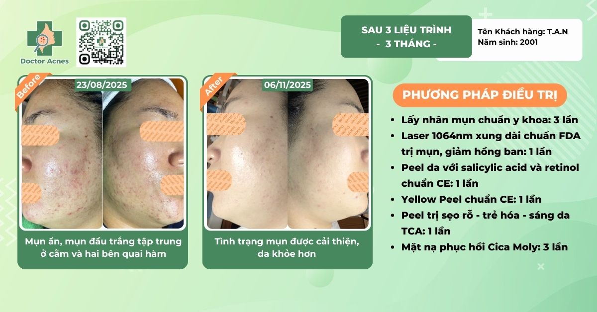 Dựa trên kết quả thăm khám, da sẽ được xây dựng phác đồ điều trị cá nhân hóa phù hợp với tình trạng hiện tại, kết hợp đúng hoạt chất, đúng phương pháp và lộ trình rõ ràng giúp rút ngắn thời gian mờ thâm. Tại Phòng khám Doctor Acnes, mỗi trường hợp thâm mụn đều được Bác sĩ theo dõi sát sao để đảm bảo bạn sẽ nhanh chóng lấy lại làn da mịn màng, tươi sáng và đều màu hơn.