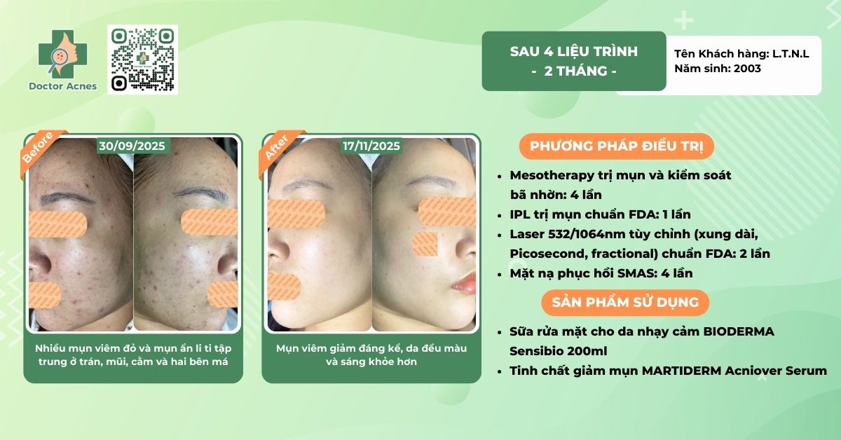 Phác đồ điều trị được xây dựng cá nhân hóa, kết hợp xử lý mụn đúng kỹ thuật, kiểm soát viêm và hướng dẫn chăm sóc da khoa học để hạn chế thâm sẹo về sau. Chủ động đi khám sớm giúp xử lý mụn đúng ngay từ đầu và tránh mất thời gian thử sai không cần thiết.