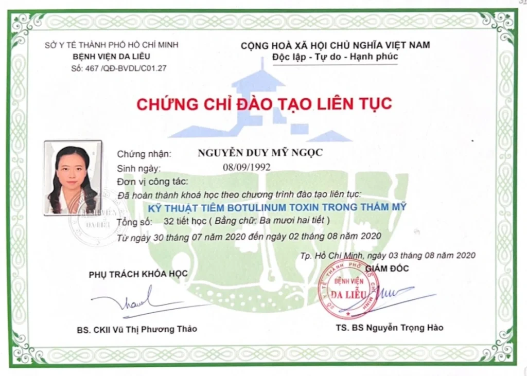 • Chứng chỉ Kỹ thuật tiêm Botulinum toxin trong thẩm mỹ (2020)