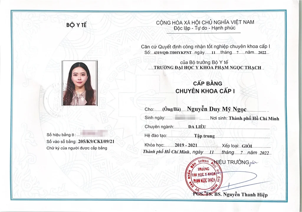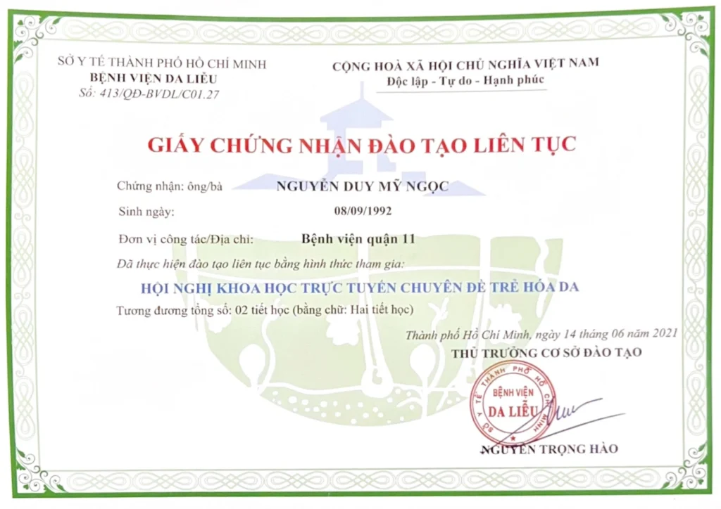 • Tốt nghiệp Chuyên khoa I Da liễu, Đại học Y khoa Phạm Ngọc Thạch (2021)