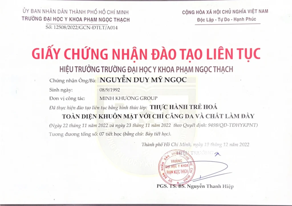 • Chứng chỉ Thực hành trẻ hóa toàn diện khuôn mặt với chỉ căng da và chất làm đầy (2022)