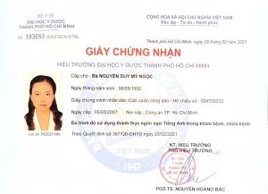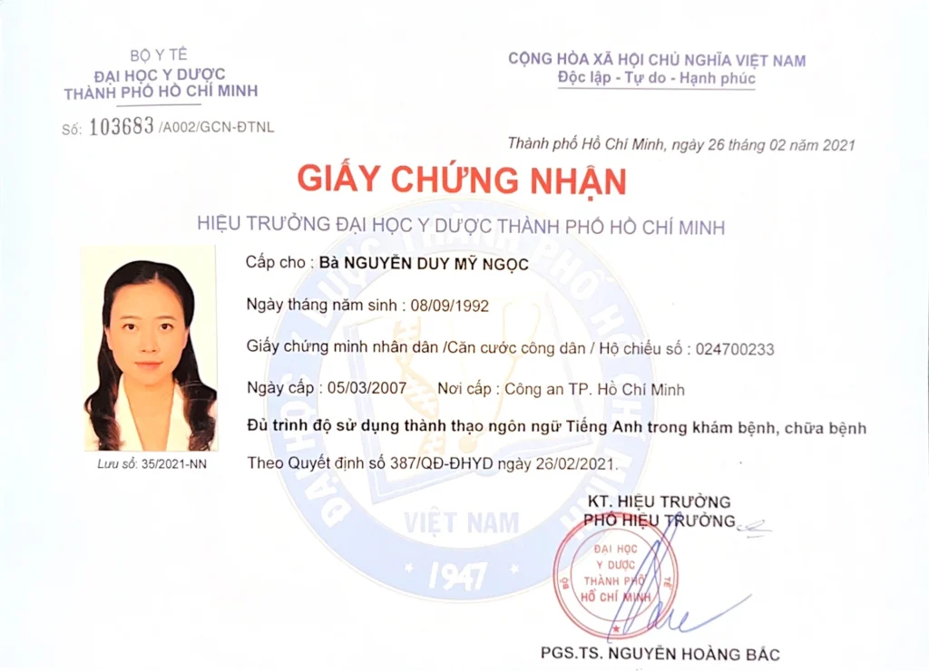 • Chứng chỉ Đủ trình độ sử dụng thành thạo ngôn ngữ Tiếng Anh trong khám, chữa bệnh (2021)