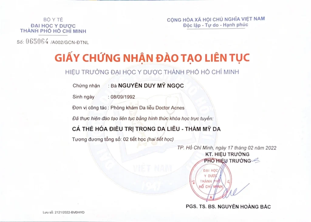 • Chứng chỉ Cá thể hóa điều trị trong da liễu và thẩm mỹ da (2022)
