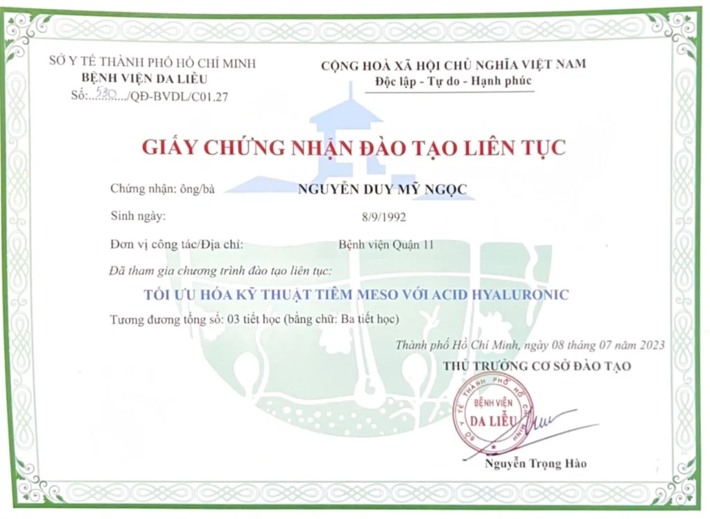 • Chứng chỉ Tối ưu hóa kỹ thuật tiêm meso với acid hyaluronic (2023)