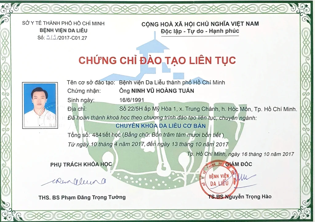 - Tốt nghiệp Chuyên khoa Da liễu sơ bộ, Bệnh viện Da liễu TP.HCM (2017)