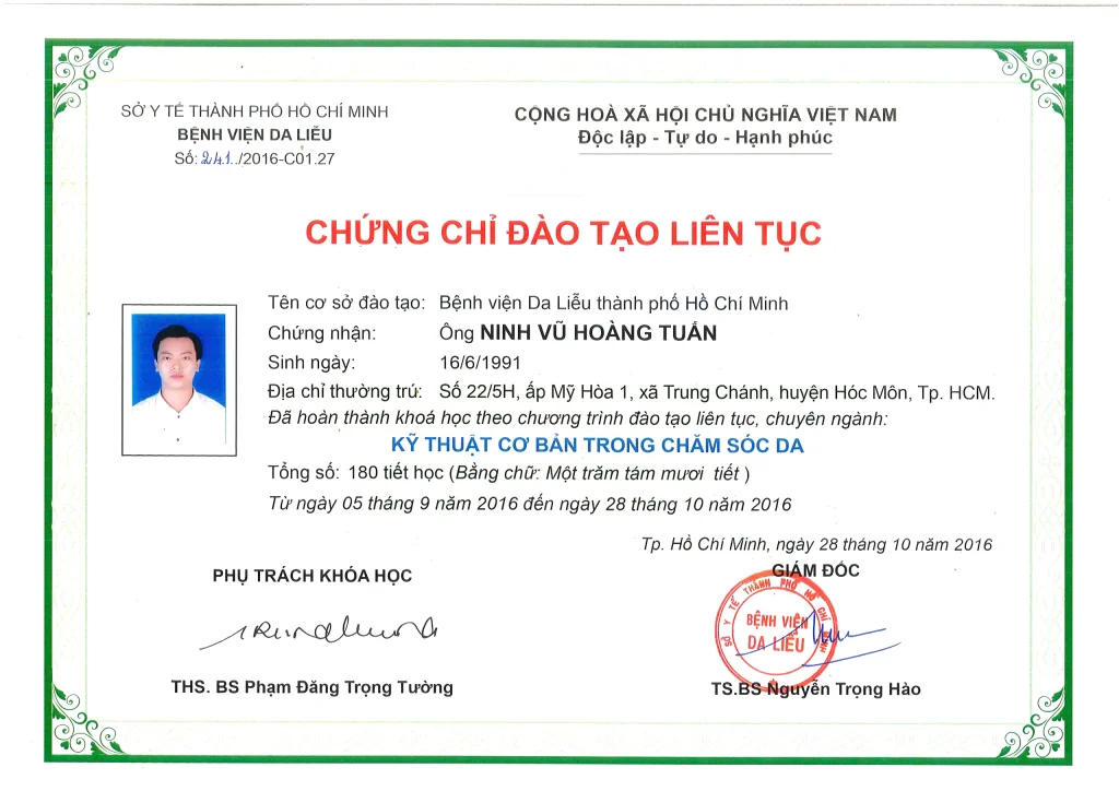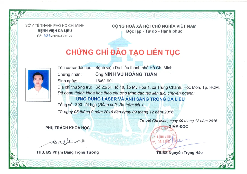 - Chứng chỉ Ứng dụng laser và ánh sáng trong da liễu, Bệnh viện Da liễu TP.HCM (2016)