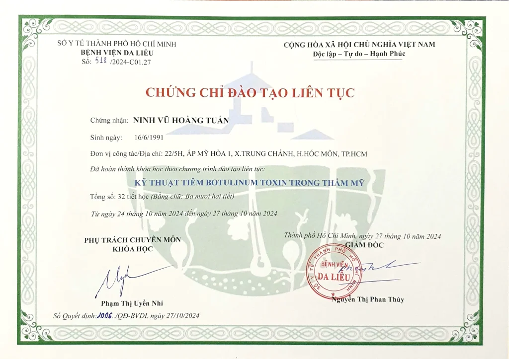 - Chứng chỉ Kỹ thuật tiêm Botulinum toxin trong thẩm mỹ (2024)