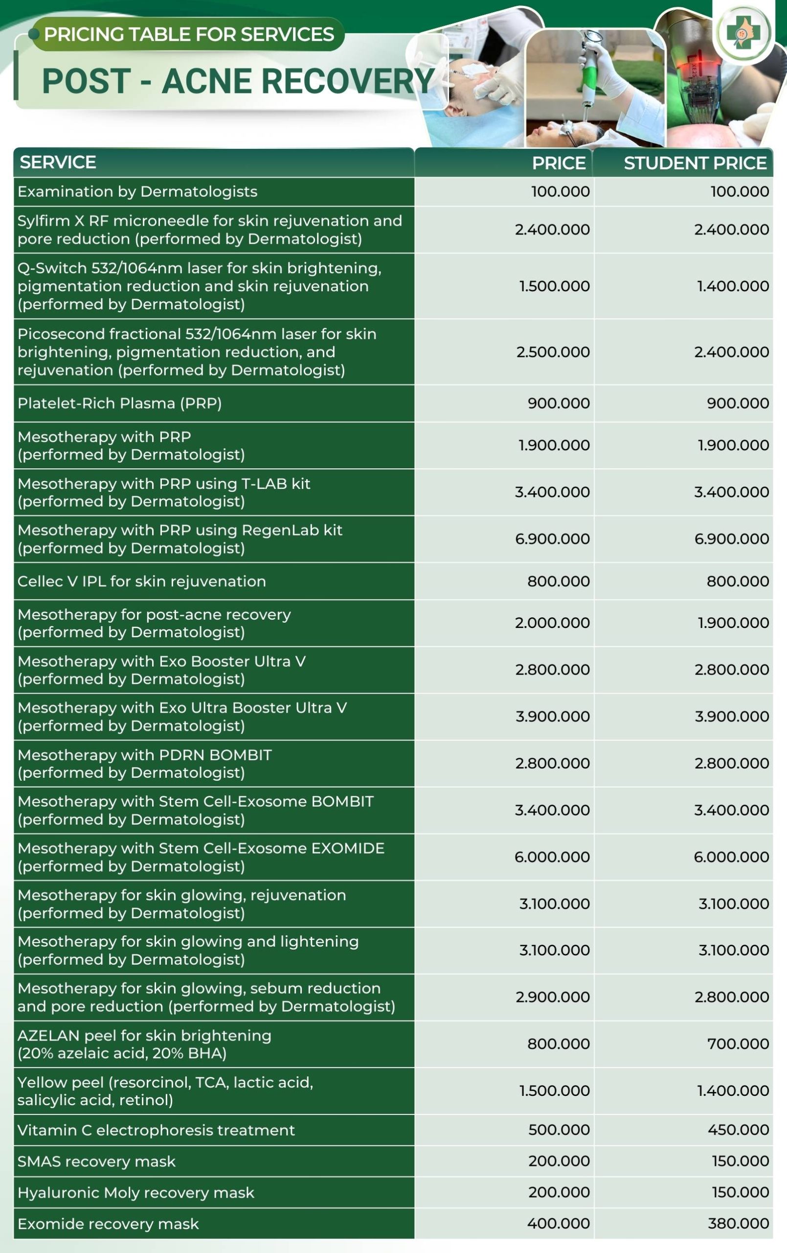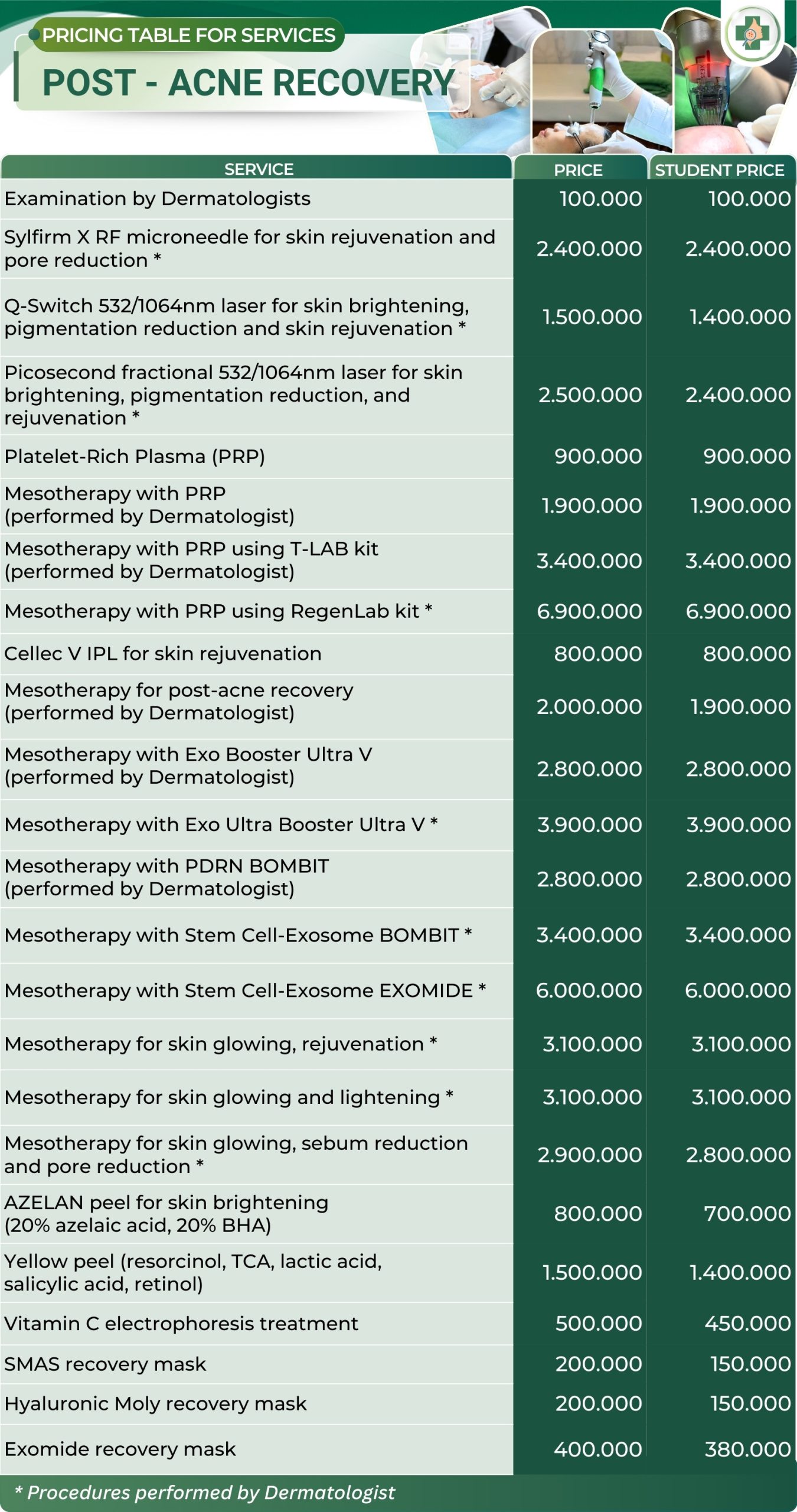 ※Microneedle RF therapy treatments require a personal disposable RF cartridge, costing 1,800,000đ/tip/1-2 uses.