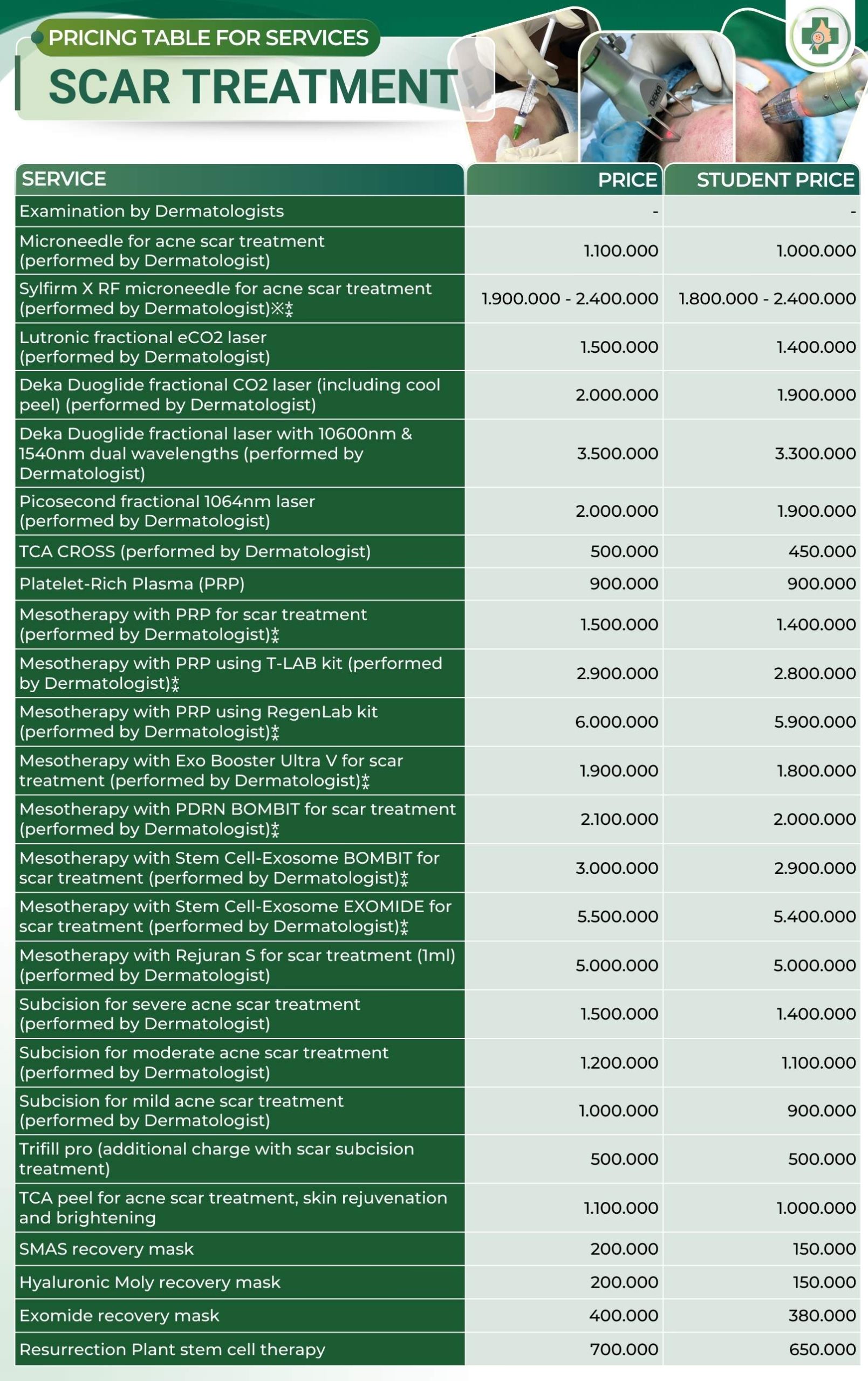Invasive procedures such as fractional CO2 laser, subcision, dermarolling, RF microneedling, TCA CROSS, and mesotherapy are performed directly by the Dermatologist. Skincare techniques are carried out by a nursing team specialized in acne and acne scar care.