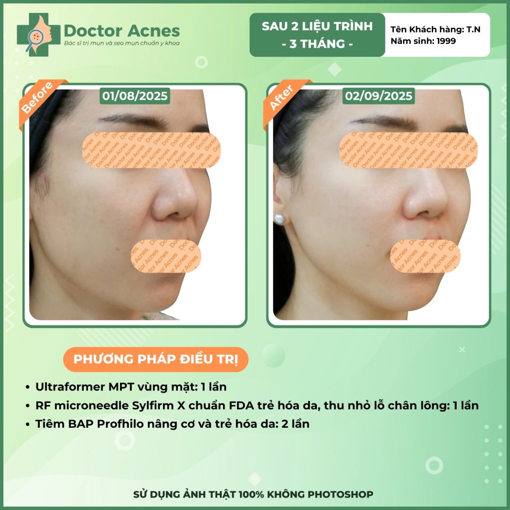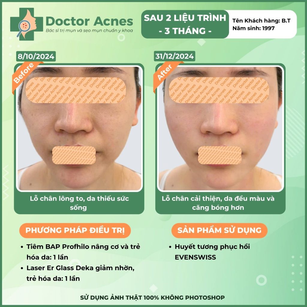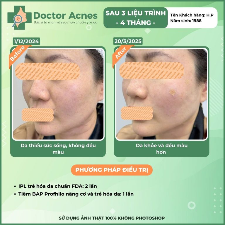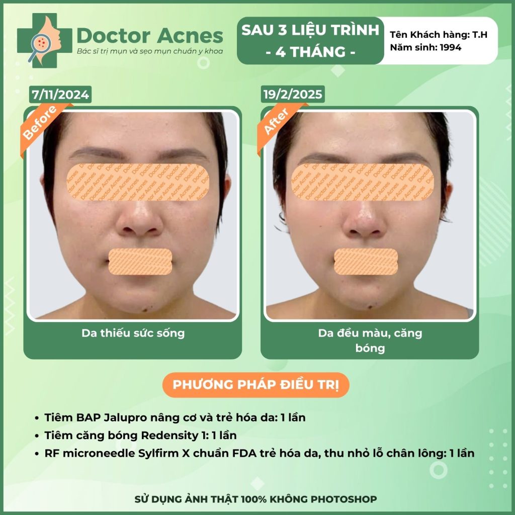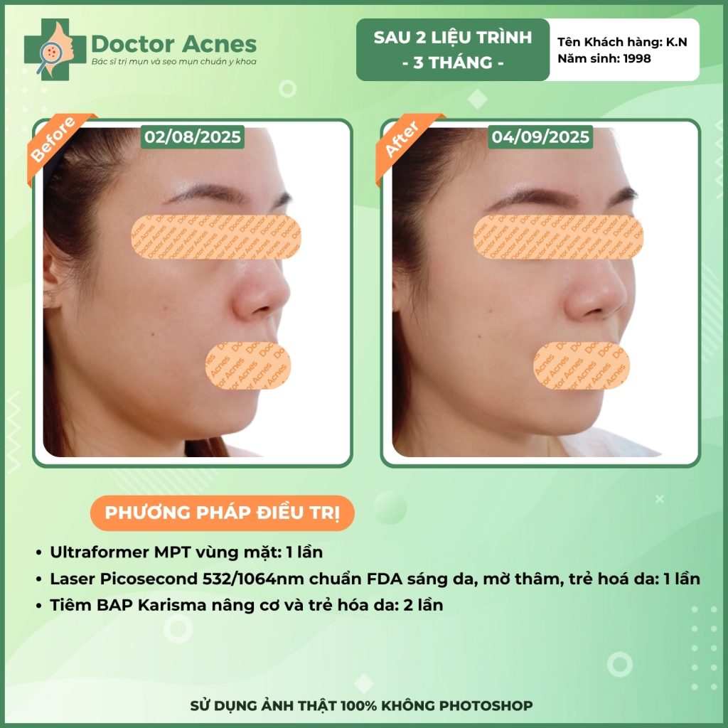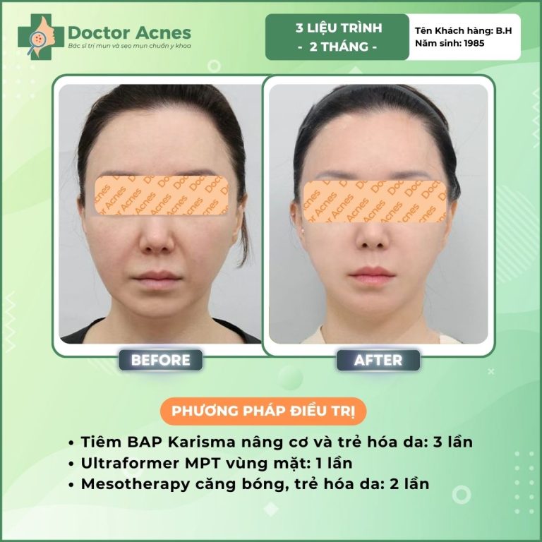 At Doctor Acnes, the BAP injection procedure uses high-end product lines widely used worldwide, including Karisma and Infini Premium F5+ Booster (Italy), Jalupro Super Hydro and Profhilo (Switzerland), Rejuran S and Gouri (Korea), helping to visibly improve aging issues, hydration, wrinkles, acne scars, and skin elasticity. Each product has a different mechanism of action and priority indication, so clients need to be examined directly before choosing.