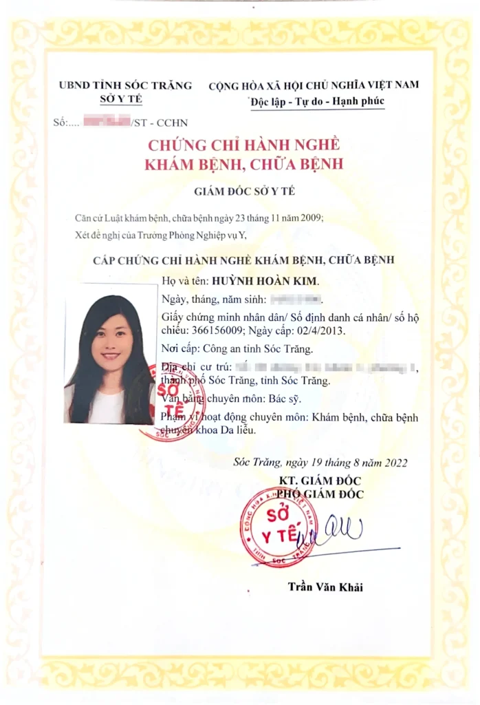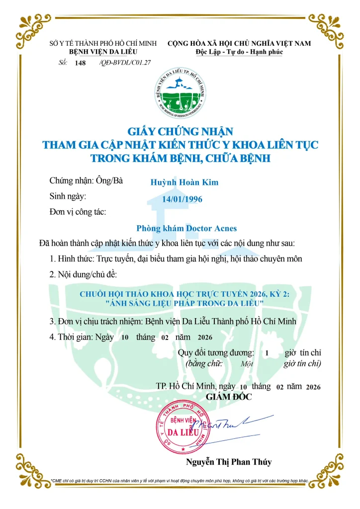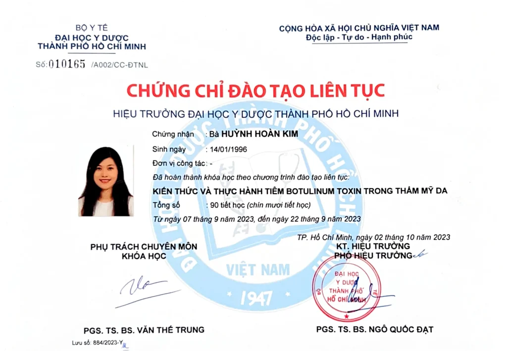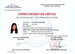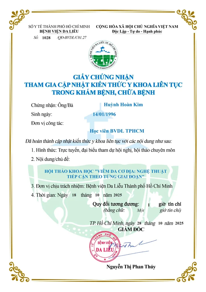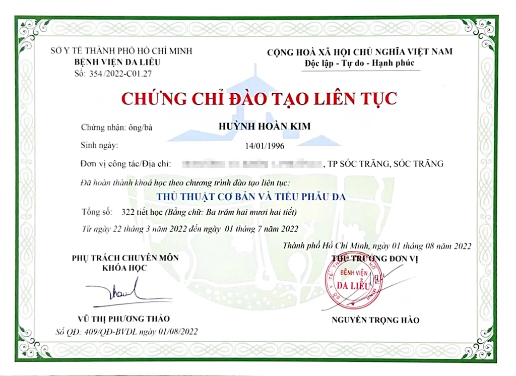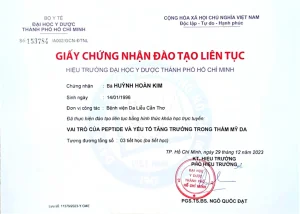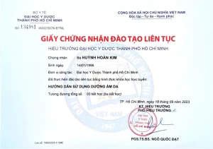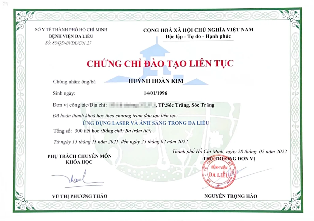 - Continuous Medical Education (CME) certificates issued by HCMC Hospital of Dermatology and UMP HCMC