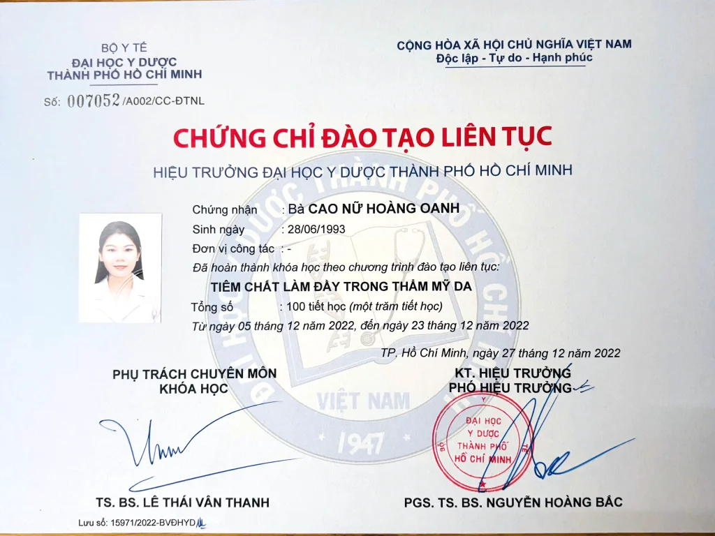 Certificate in Dermal Filler Injection in Aesthetic Dermatology – University of Medicine and Pharmacy, Ho Chi Minh City (2022)