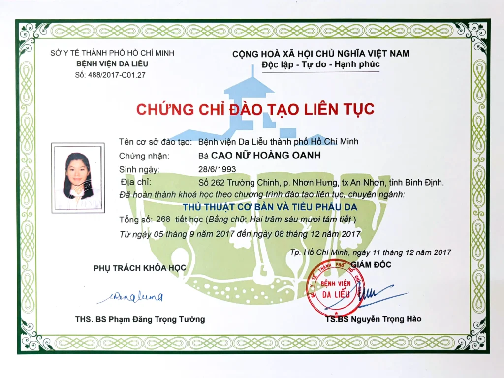 Certificate in Basic Dermatologic Procedures and Minor Skin Surgery, Hospital of Dermatology, Ho Chi Minh City (2017)