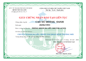 Dr. Cao Nu Hoang Oanh graduated as a Specialist Level 1 Doctor in Dermatology from the University of Medicine and Pharmacy, Ho Chi Minh City. She possesses many years of experience in the examination and treatment of acne vulgaris and post-acne sequelae such as post-inflammatory hyperpigmentation and acne scars; experience in the management of keloid scars; and provides consultation and treatment for fungal skin infections, contact dermatitis, skin allergies, skin aging, and other dermatological conditions.