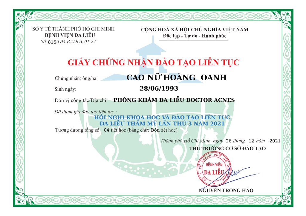 Various Certificates of Continuing Medical Education (CME) issued by the Hospital of Dermatology, Ho Chi Minh City and the University of Medicine and Pharmacy, Ho Chi Minh City