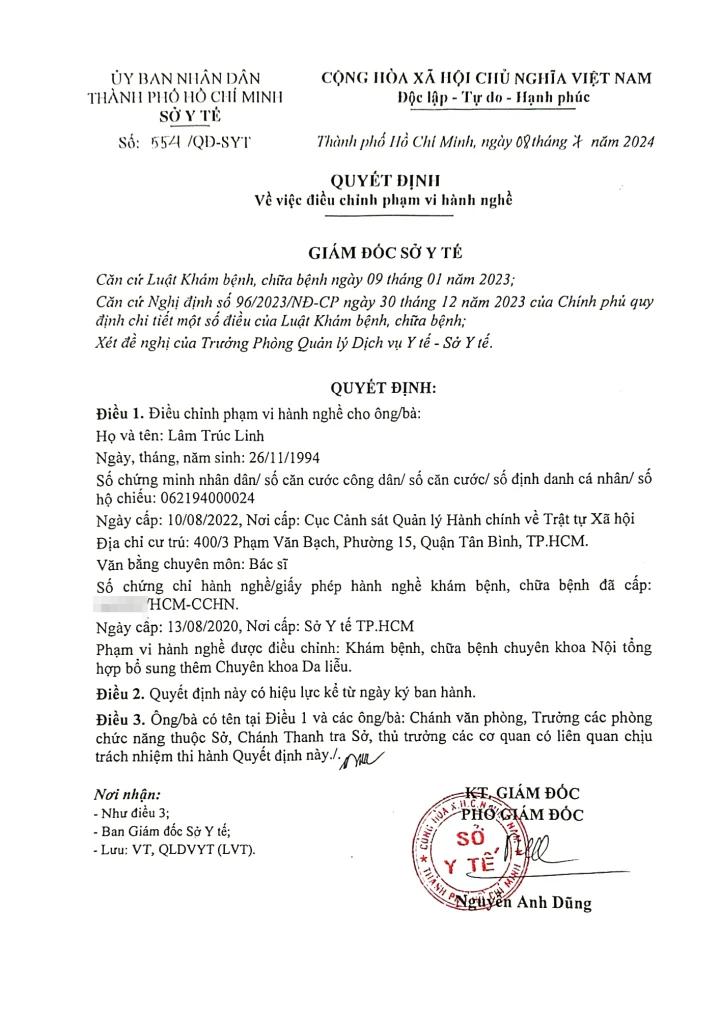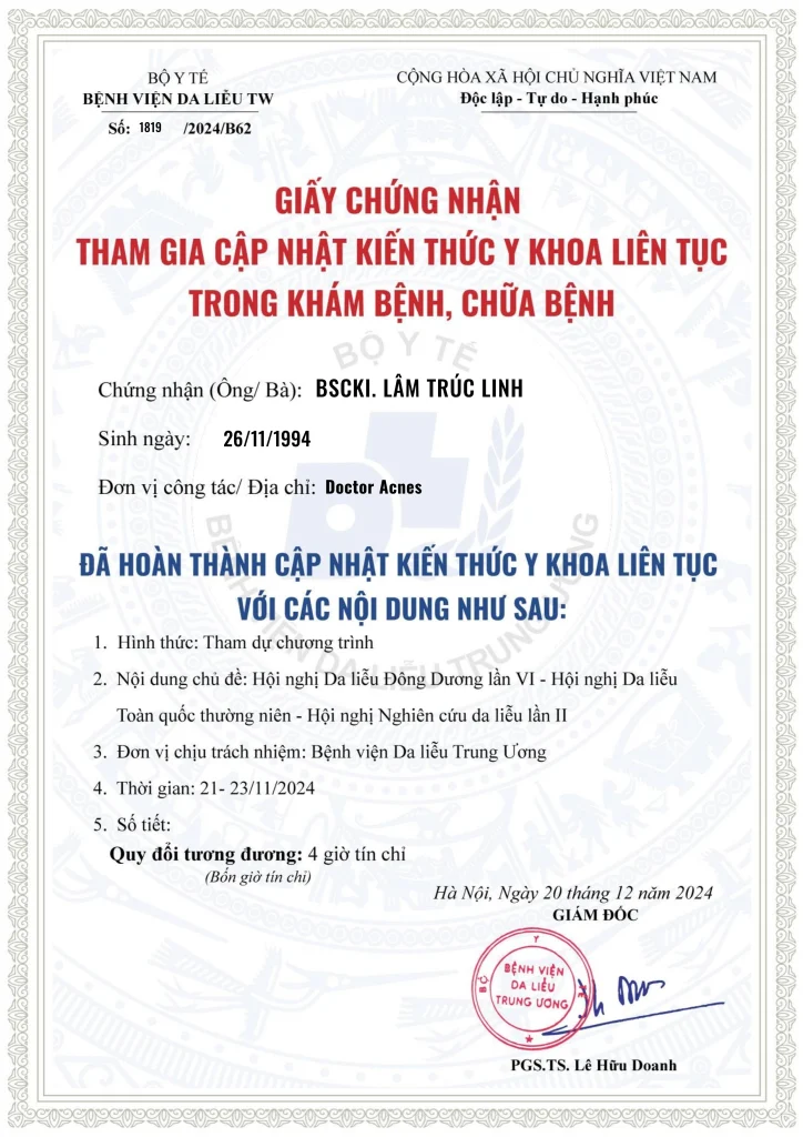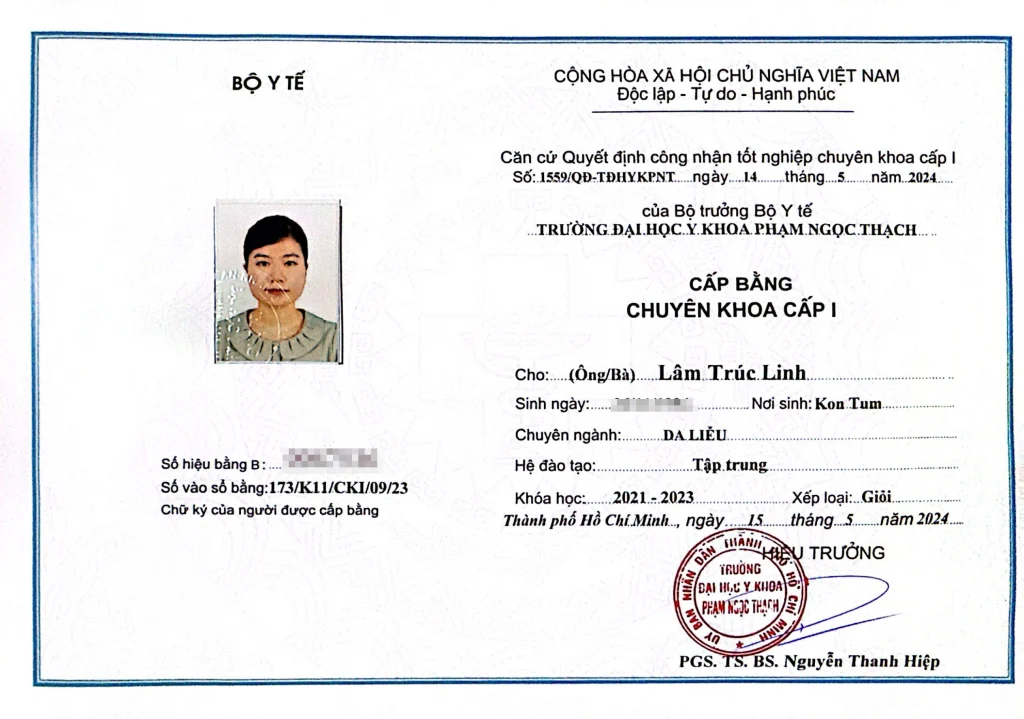 Dr. Lam Truc Linh obtained her Medical Doctor degree from the University of Medicine and Pharmacy, Ho Chi Minh City, and graduated as a Specialist Level 1 Doctor in Dermatology from Pham Ngoc Thach University of Medicine. She has extensive experience in aesthetic dermatology, specializing in consultation and treatment for acne, acne scars, and skin rejuvenation, as well as the effective diagnosis and management of various other dermatological conditions.