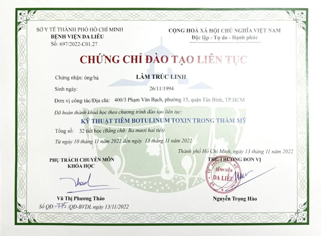 Certificate in Botulinum Toxin Injection Techniques in Aesthetic Dermatology, Hospital of Dermatology, Ho Chi Minh City (2022)