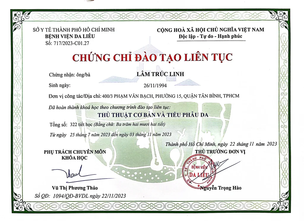 Certificate in Basic Dermatologic Procedures and Minor Skin Surgery, Hospital of Dermatology, Ho Chi Minh City (2023)